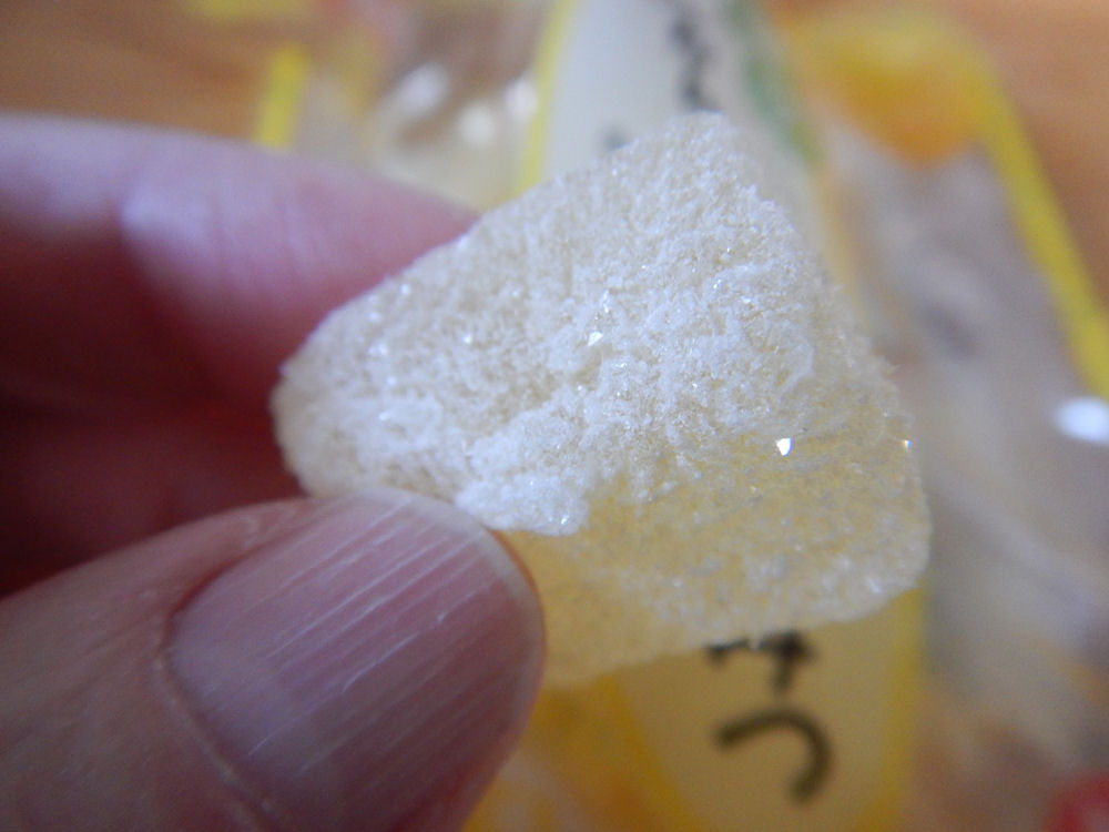 柚子のような黄色の、お餅には、白い粉(加工でん粉)で、お餅同士が、くっつかないようにしてますね。