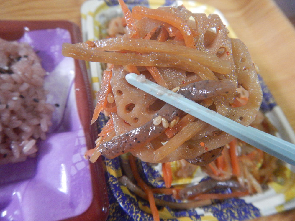 ピリ辛に、お赤飯の、あっさりした塩味が合いますね。ゴマ塩は、かけない方が美味しいです。