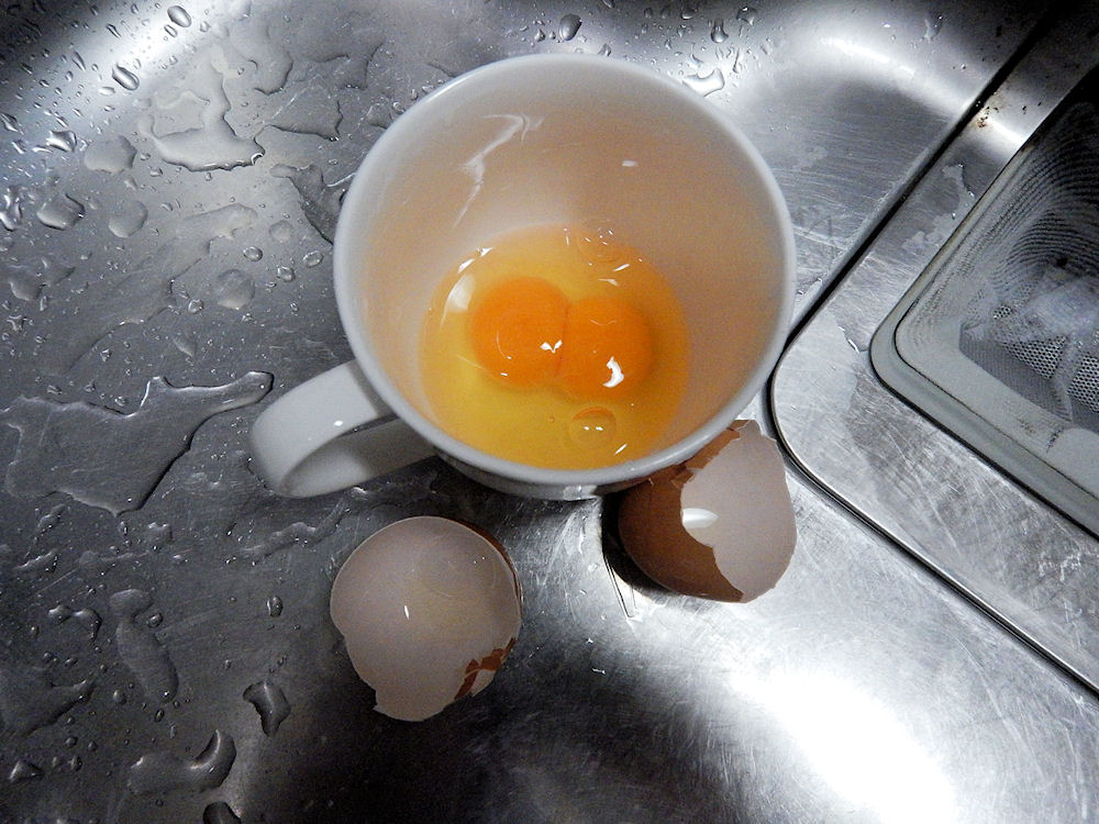 と思っていたらカップの中に黄身が二つ!双子だぁ!