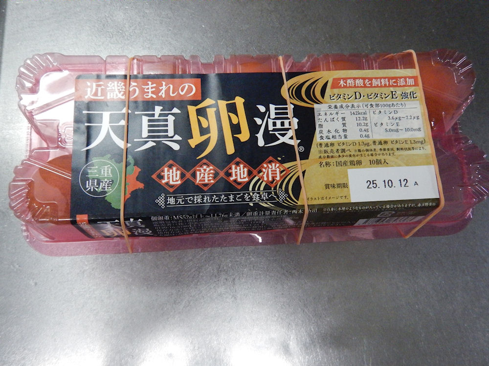 双子の卵はスーパーで買って来た三重県産の「天真卵漫(てんしんらんまん)」という卵。(税込300円)。ビタミンDやビタミンEを強化した卵なのです。