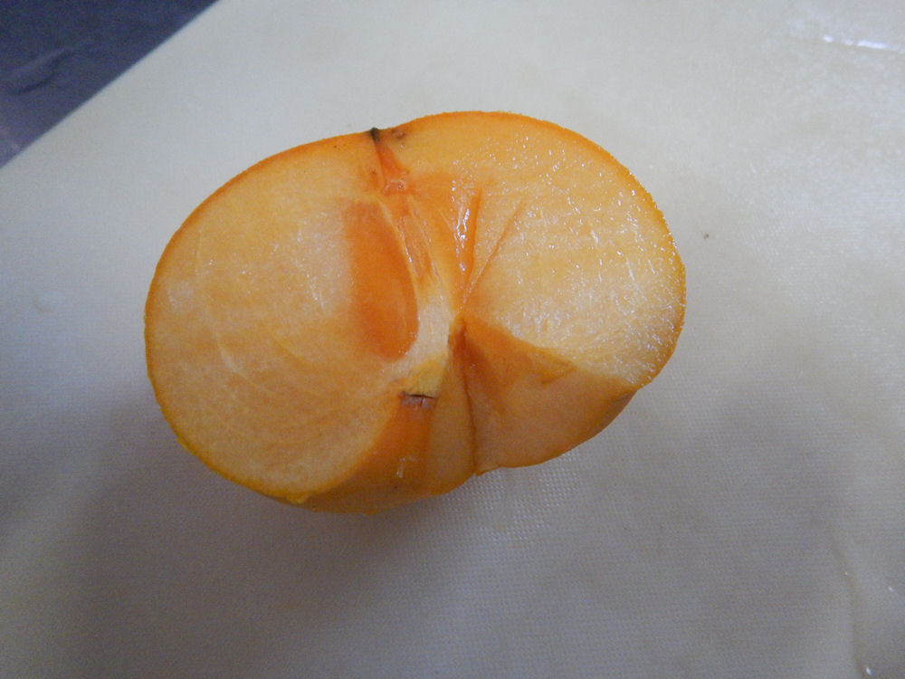 柿を包丁で切ると種が無いですね。柿の種って大きいです。子供の頃、あの大きな柿の種が邪魔で、種ばかりで実が無いと思った事もありました。