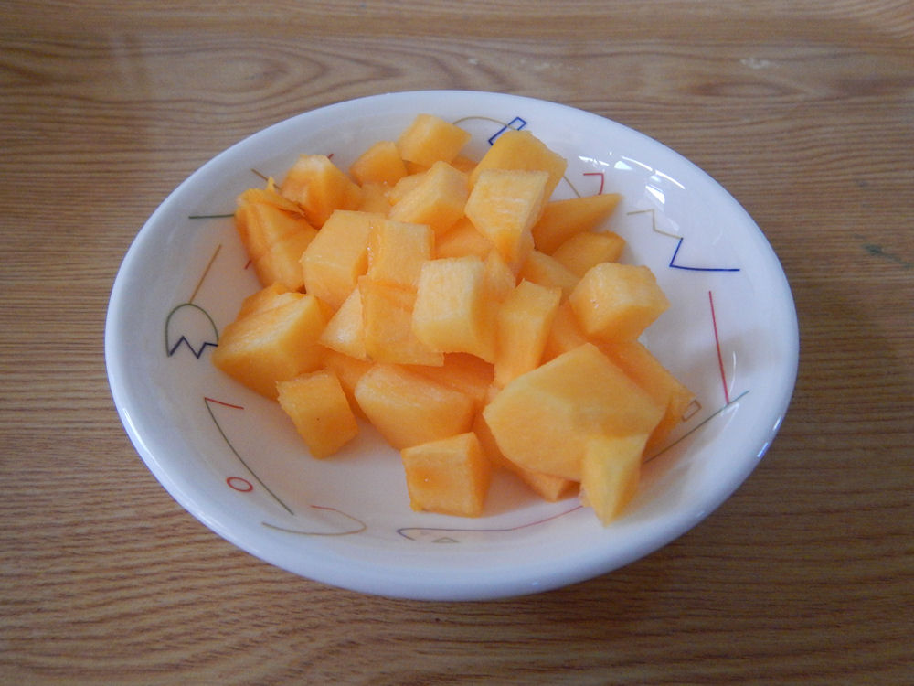 普通、柿を食べる時は、こんなに小さく切りませんが、今回はヨーグルトと一緒に食べるので小さく切りました。