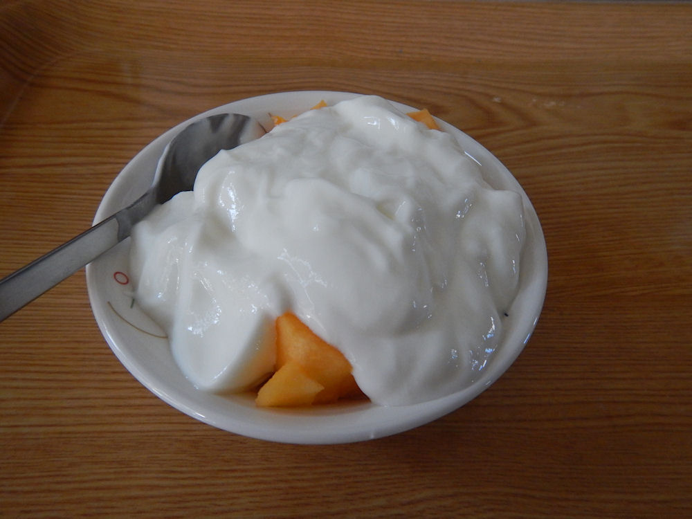 柿にヨーグルトをかけます。量は測っていないけど、100g以上あると思います。