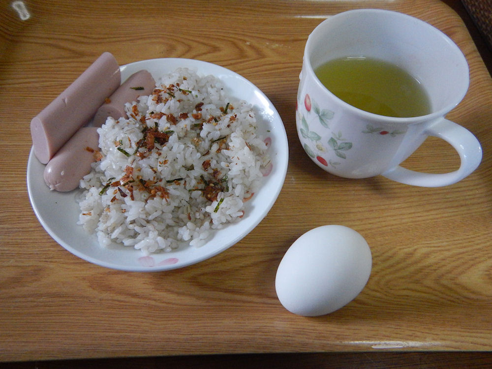 おさかなソーセージ」。朝食と言えば卵。今朝は、ゆで卵だけど、殻はむいていません。そして日本茶(玄米茶)です。
