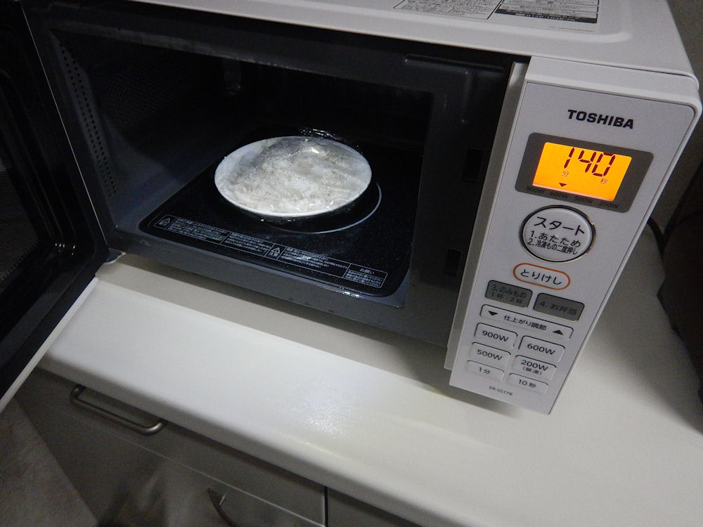 しっかりラップをして、電子レンジの600Wで2分(500Wなら2分30秒)、温めます。