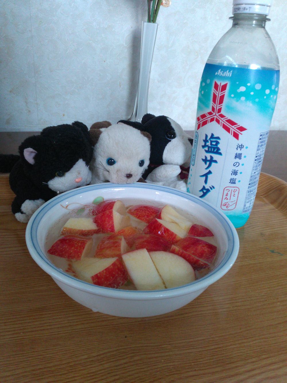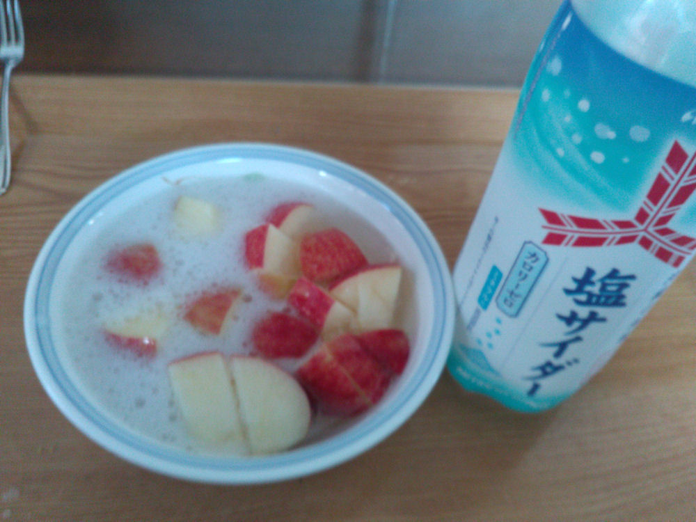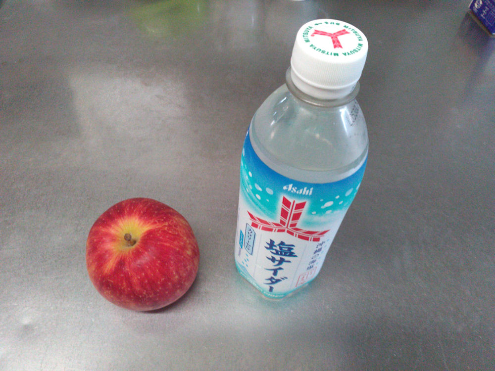 ただ、リンゴを食べるだけでは、つまらないので、冷蔵庫に入っていた「三ツ矢塩サイダー PET500ml」価格は税込105円。