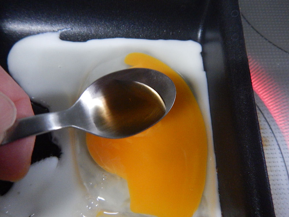 油を入れたフライパンに落とした玉子の黄身を潰して、スプーンに入れた、麺つゆをかけます。