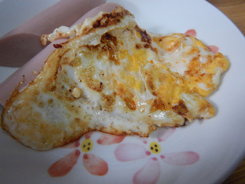 玉子の焦げ目と麺つゆの焦げ目が付いている目玉焼き。