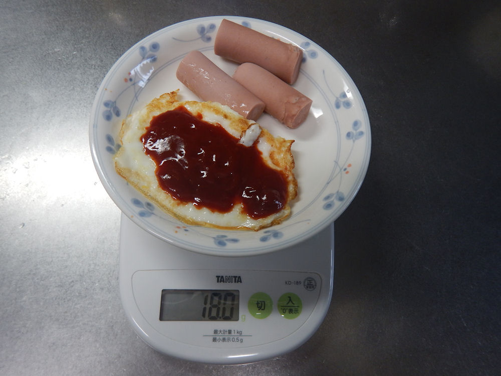 今朝の朝食は目玉焼きの両面焼き。まずは、お皿に目玉焼き、そしておさかなソーセージをのせて、キッチンスケールをリセット。