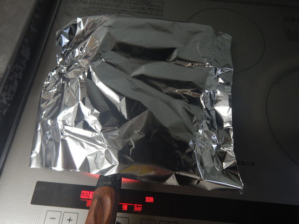 アルミホイルでフタをします。。。四角いフライパン用のフタを持っていないのです。。。