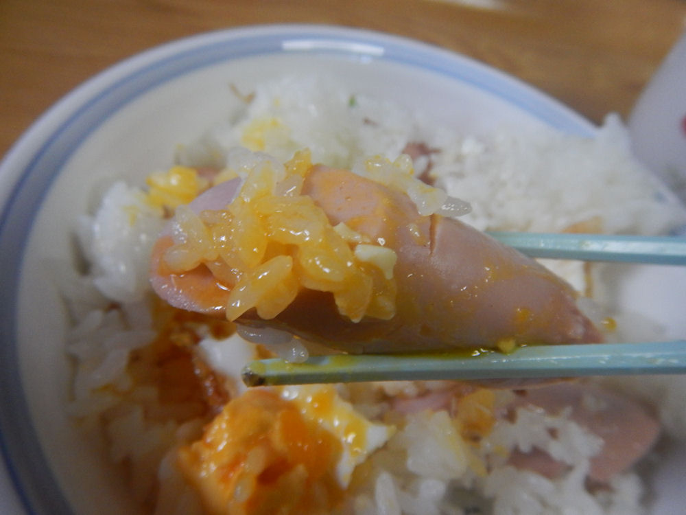 ライスの中の、おさかなソーセージは、トップバリュ「塩分30%カット DHA・EPA入り おさかなソーセージ」。