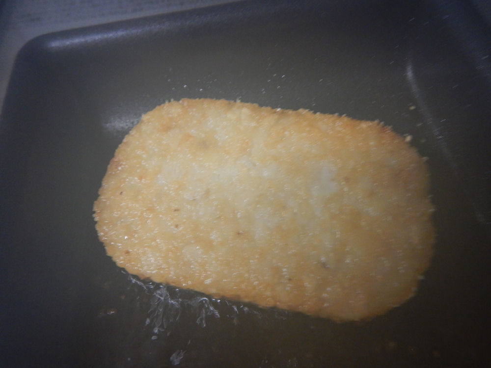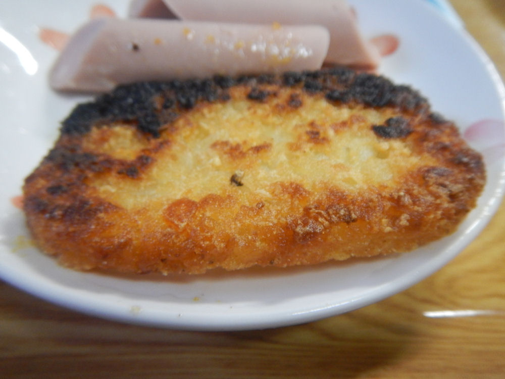 ハッシュドポテトをお箸を使って割った写真です。これだけ焦げたので、中もしっかり調理。
