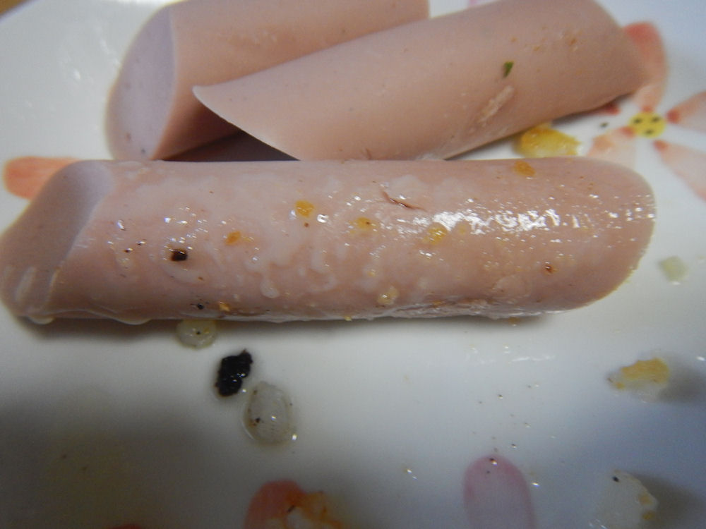 ハッシュドポテトの油でベタベタの、おさかなソーセージは、トップバリュ「塩分30%カット DHA・EPA入り おさかなソーセージ」。電子レンジの600Wで50秒、温めました。