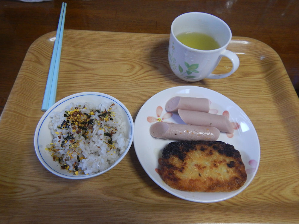 はくばくの「もち麦ご飯」に、丸美屋のふりかけ「味道楽」。そして日本茶(玄米茶)です。