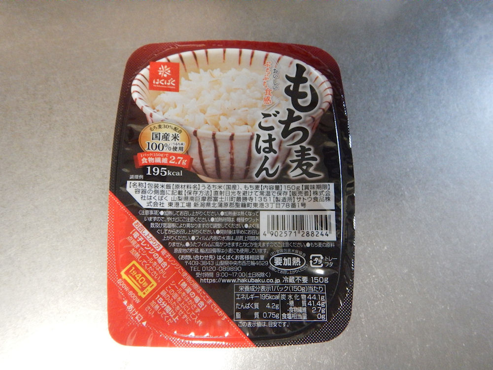 はくばくの「もち麦ごはん 無菌パック」は、。1パック(150g)の中に食物繊維2.7g、入っています。