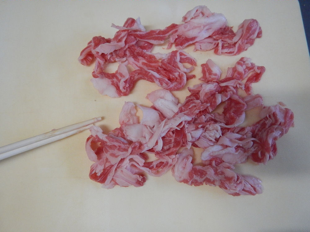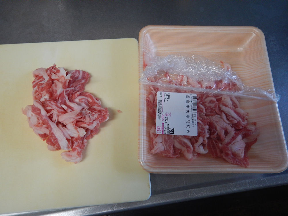 パックの中の牛肉は、くっついているので、まな板の上で広げます。