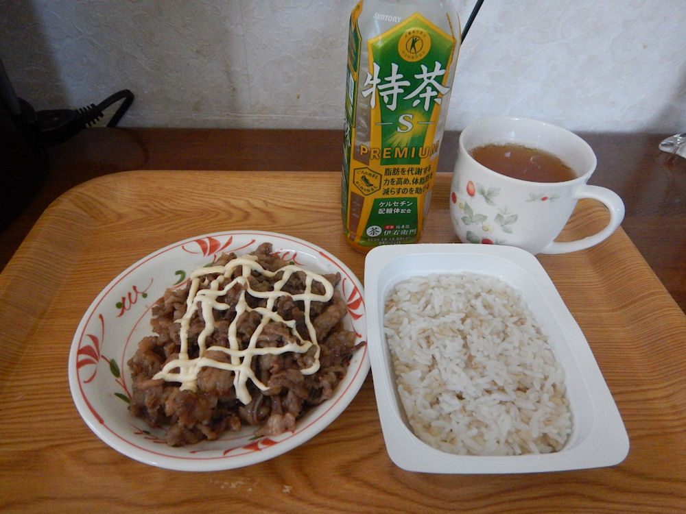 マヨネーズをかけて、電子レンジで温めた、もち麦ごはんと、伊右衛門・特茶sをセットしたら出来上がり!