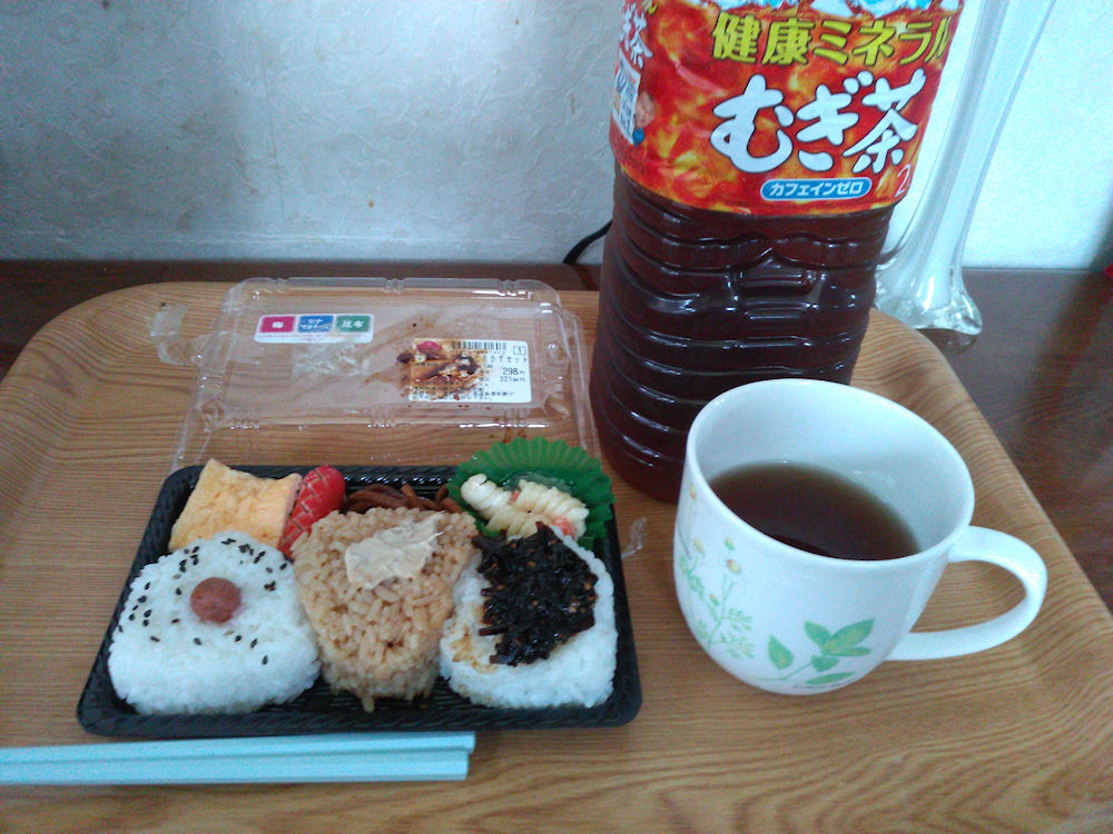 そこで、スーパーの中をウロウロしていたら、お惣菜売り場に「トップバリュ:3種のおにぎりとおかずセット」(税込321円)と言うのがあって、梅干しの、おむすびと、ウィンナーが入っている。。
