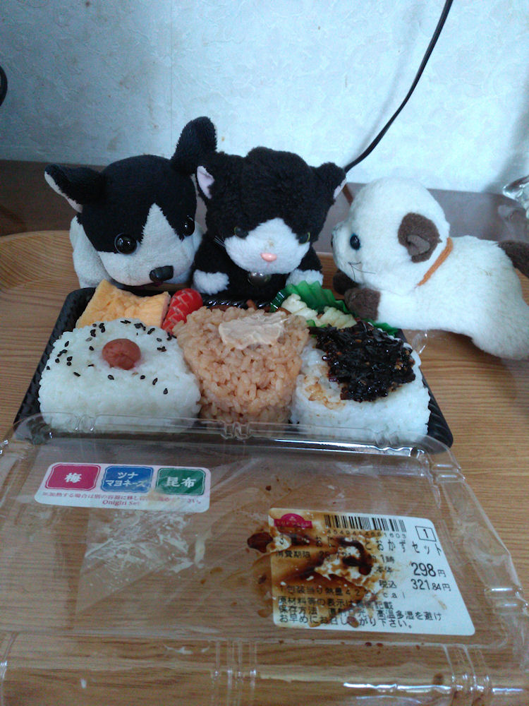 おにぎり3種類。仲良く食べる犬が1匹、猫が2匹ですが。。。