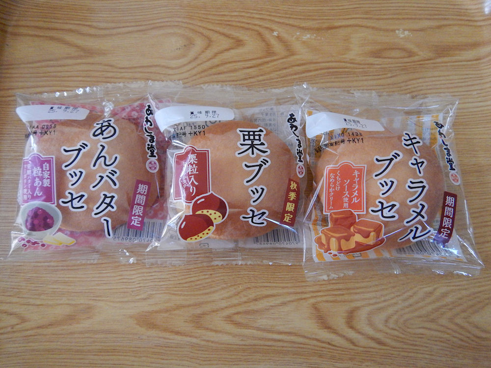 4っの中から選んだのは「栗ブッセ」、「あんバターブッセ」、「キャラメルブッセ」の3種類。この3種類のブッセは期間限定なのです。だから、今、食べないとね。ちなみに、あわしま堂のブッセですけど、ここでは特売の価格ですが、普段は税込100円ぐらいです。