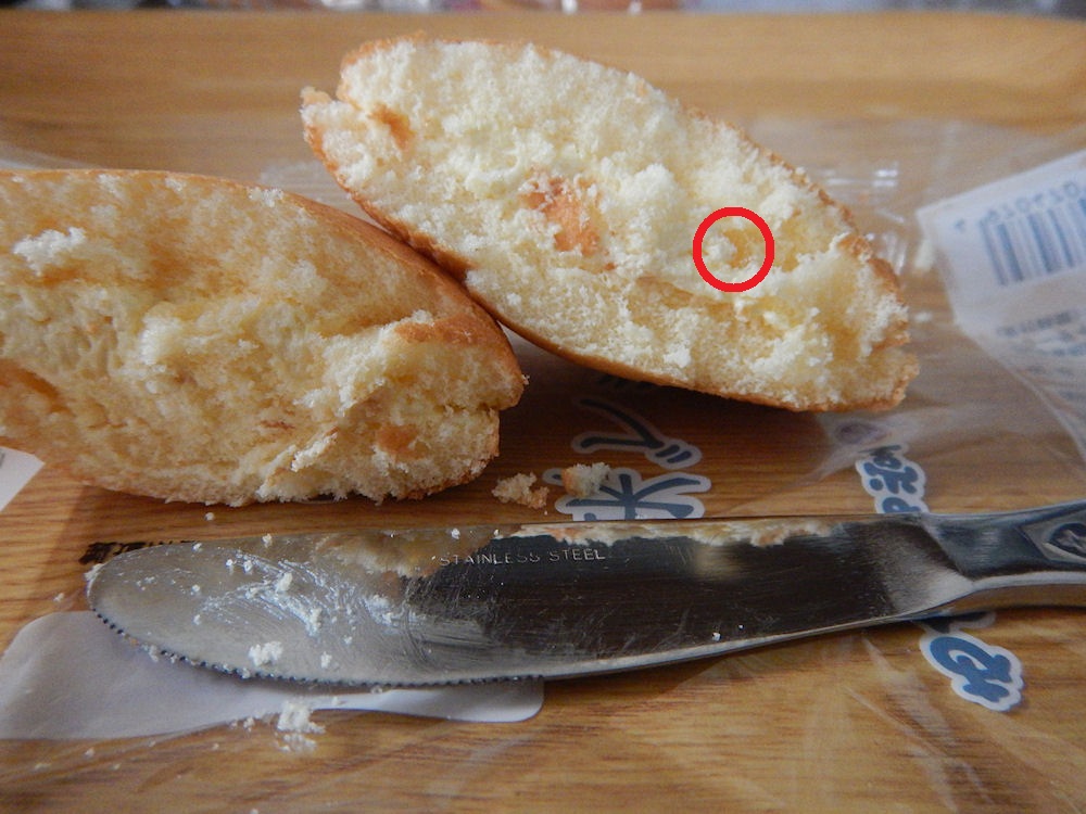下の写真は、あんバターブッセをナイフで切った写真です。赤丸部分に小豆の皮が見えますね。