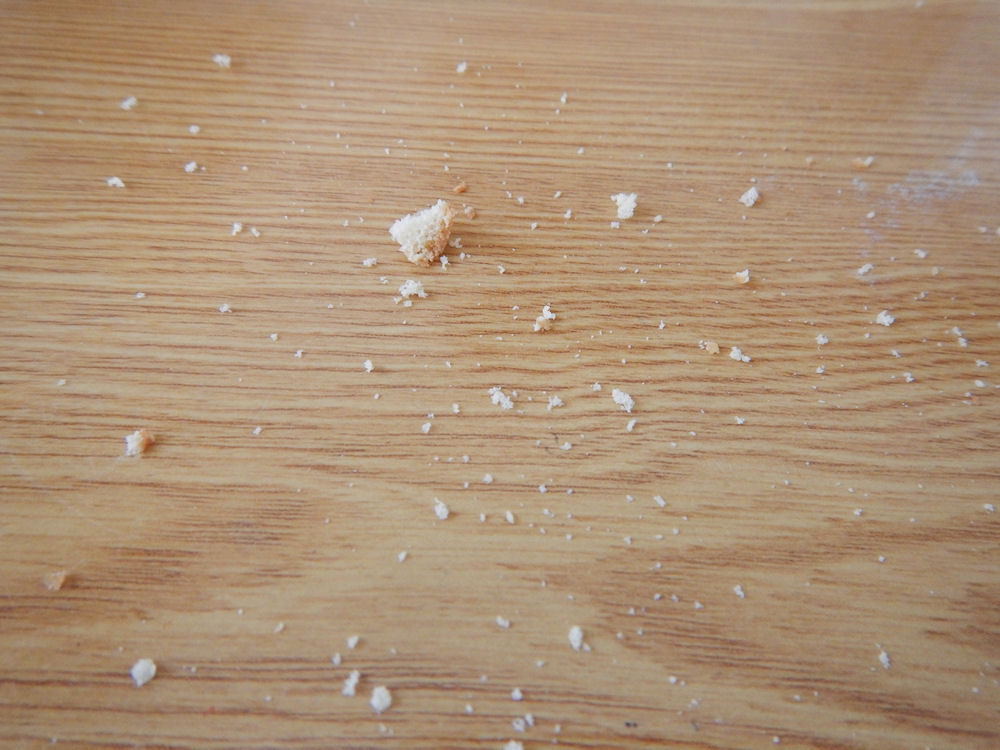 ブッセを食べた後、テーブルのトレイの上は、ブッセの小さな生地が。。。食べる時は、テーブルの上などで食べましょう。