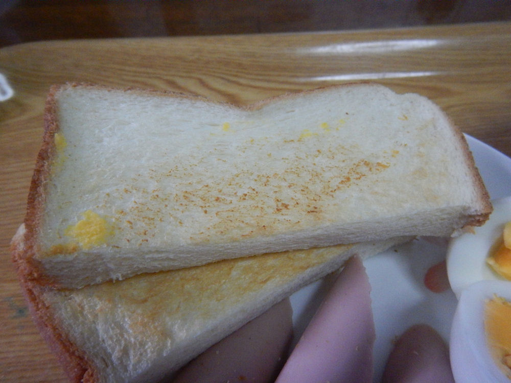 食パンに付いている黄色は、ゆで卵を包丁で切った時に包丁に付いた黄身です。