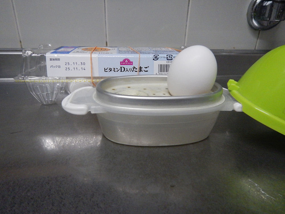 簡単調理はゆで卵。私の場合、ゆで卵は専用容器にセットして、電子レンジで温めるだけだから簡単。