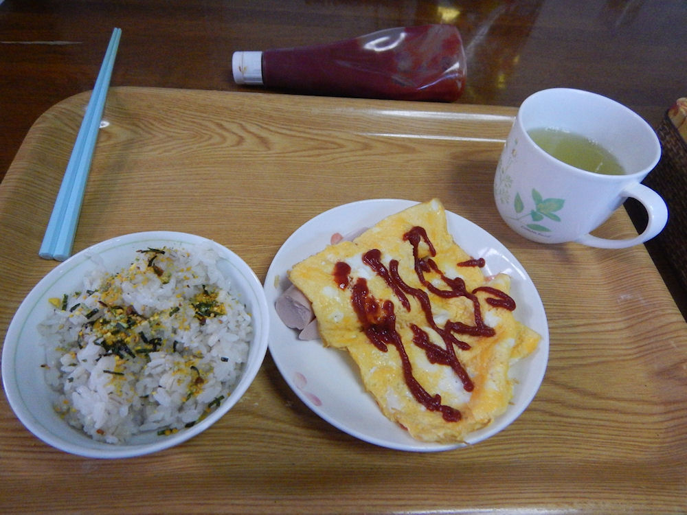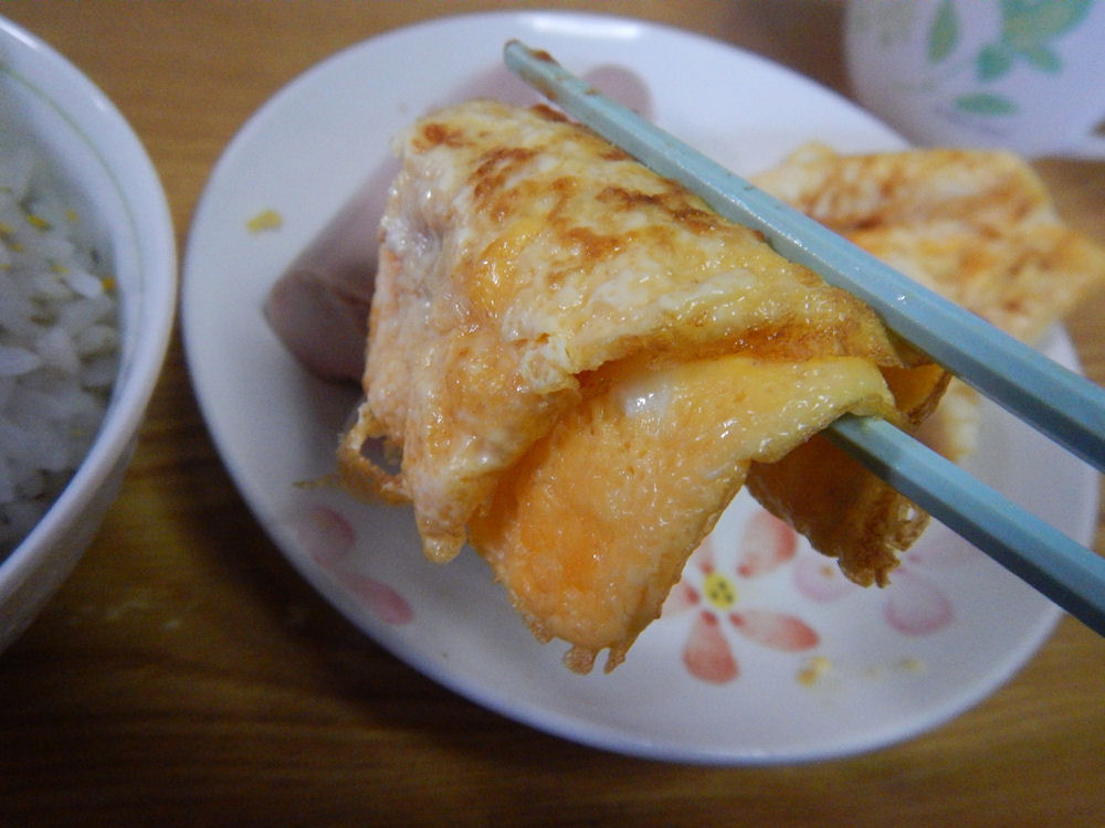 玉子焼きを折り曲げて、お箸で食べる大きさに切って食べました。ふんわり玉子とトマトケチャップの甘味が美味しいです。
