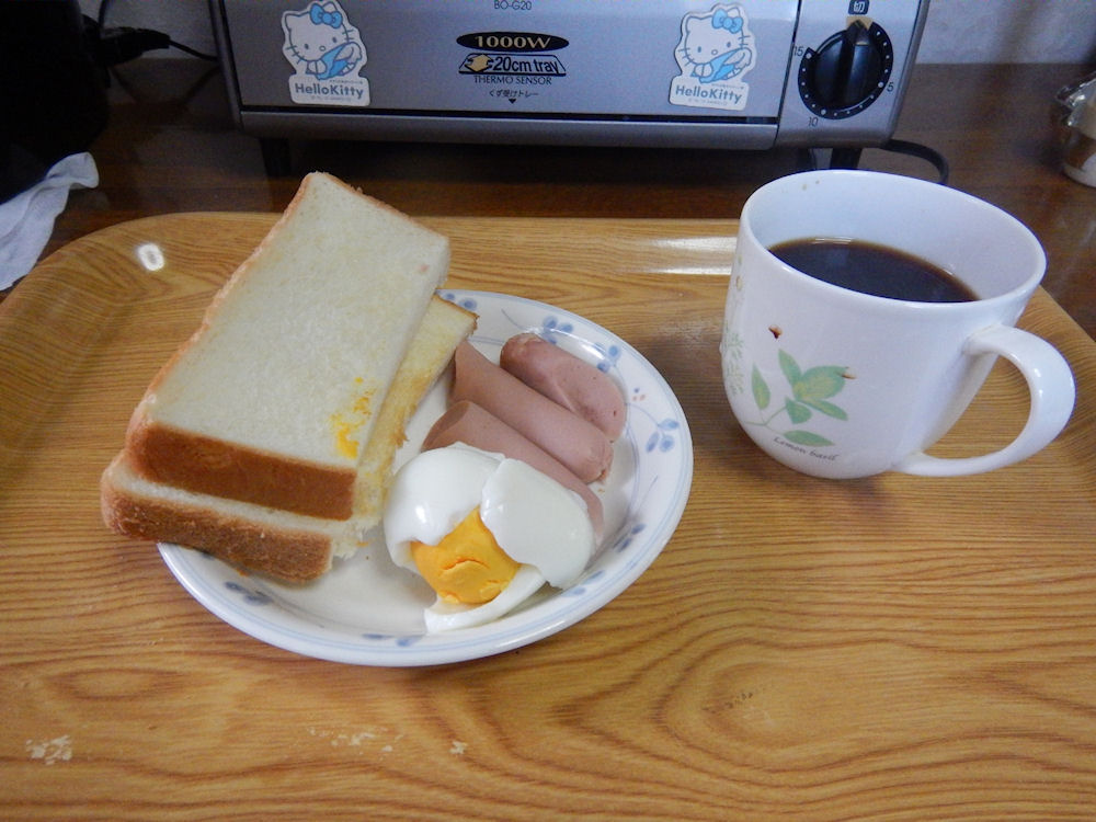 今日の朝食は、1000Wのオーブントースターで余熱なし2分、焼いたトースト。電子レンジで600W1分温めた、おさかなソーセージ。それと、インスタントのブラック珈琲(ネスカフェゴールドブレンド)です。