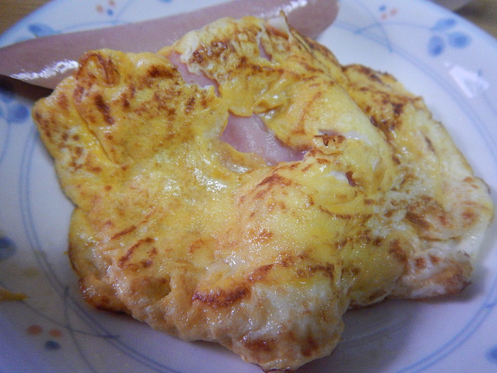 めんつゆを入れすぎて、焦げ目のような色が付いたハムエッグ。