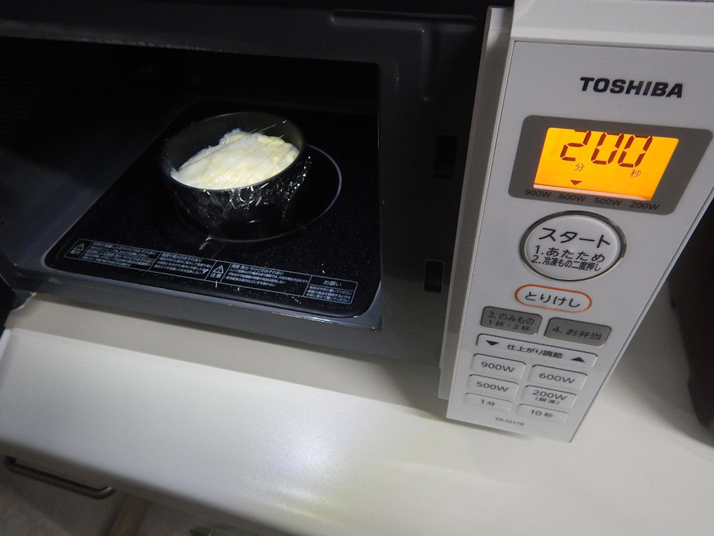 しっかりラップをして、電子レンジの600Wで2分(500Wなら2分30秒)、温めます。