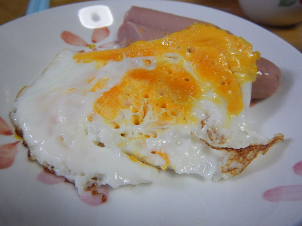 上の写真の目玉焼き、よく見ると、白身や黄身が、なんとなく半熟の部分がありますね。