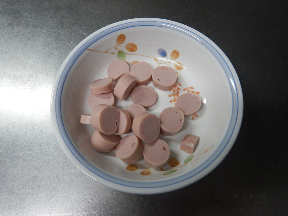 おさかなソーセージは、トップバリュ「塩分30%カット DHA・EPA入り おさかなソーセージ」を、少し薄切りに切ります。おさかなソーセージは丸いので、包丁で切っている時に、コロコロ、転がって、まな板ら落ちそう。。。