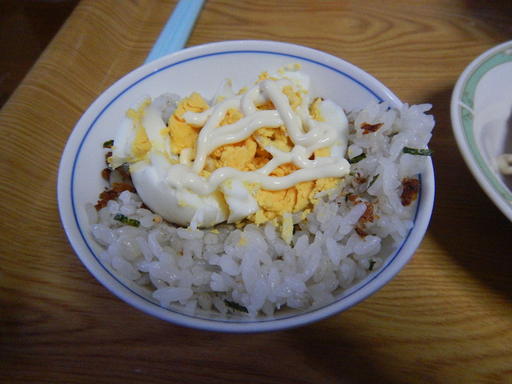 少なくなった、もち麦ご飯に、ゆで卵をのせて、お箸で、ゆで卵をつぶした後にマヨネーズをかけました。