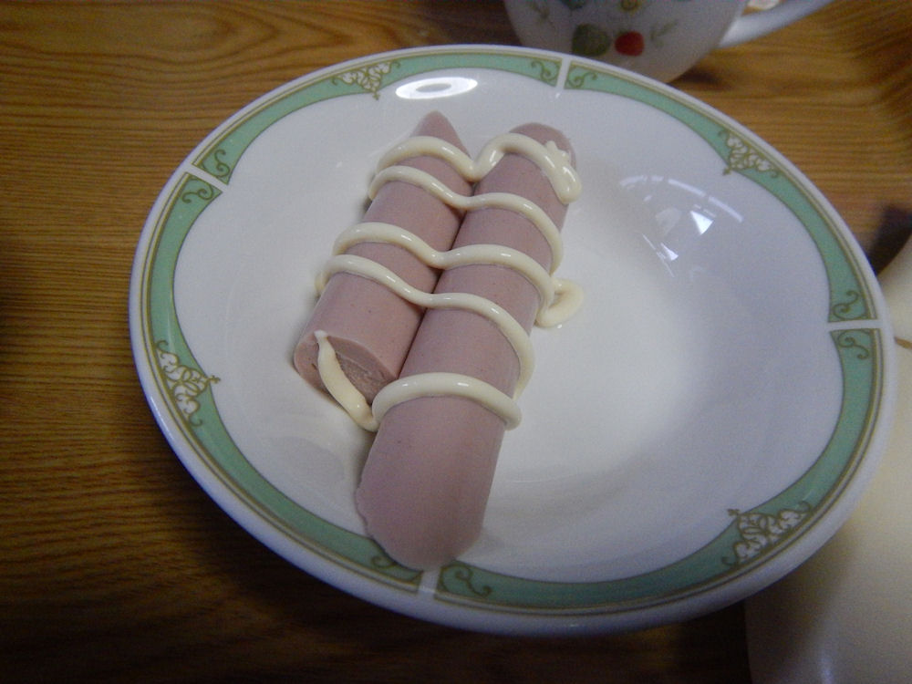 チンするのを忘れていたからではないけど、おさかなソーセージにもマヨネーズをかけて食べました。