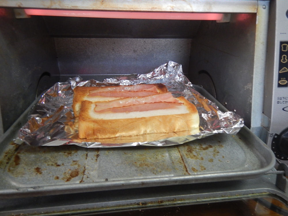 その食パンを半分に切って、ベーコンをのせて、アルミホイルを敷いて、オーブントースターで予熱なしの5分、焼いて出来上がり!