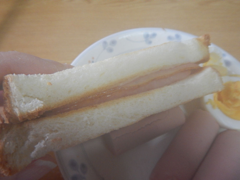 カリカリ、サクサク、香ばしいパン。しっかり焼いても焦げ臭くない香ばしさ。ベーコントーストサンドの美味しさです。そして、柔らかいベーコンのハムのような味が美味しいです。