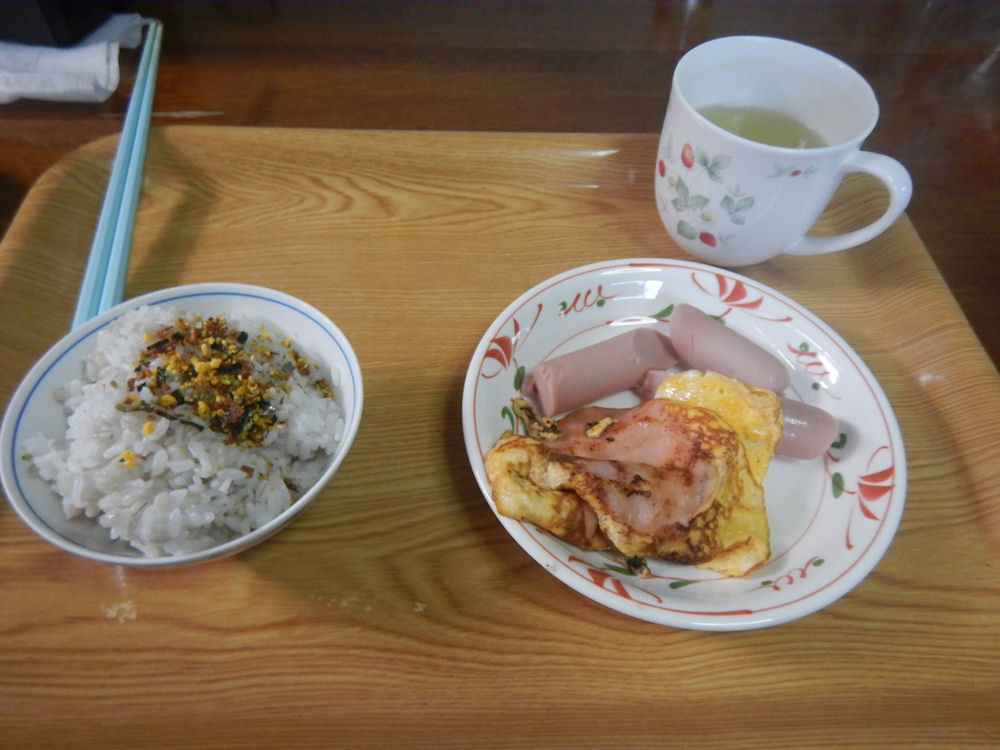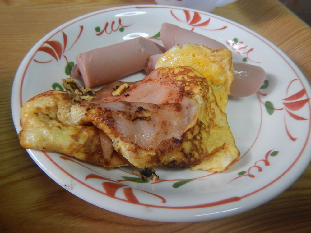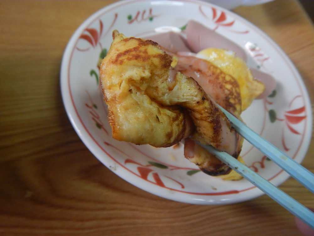 今日の朝食はハムエッグ。卵とハムの料理だからハムエッグ。今朝は、玉子焼きのハムエッグを作りました!
