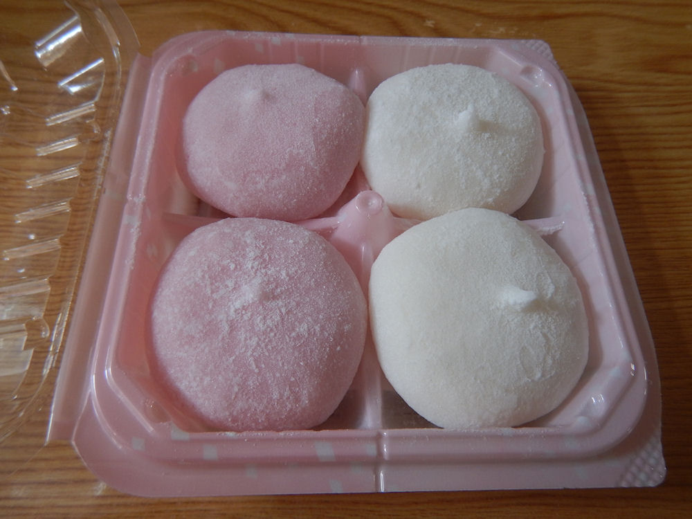 大福の上には、白い粉が付いていますね。この白い粉は、原材料名を見ると「加工でん粉」だと思います。大福同士の、くっつき防止などに使っています。
