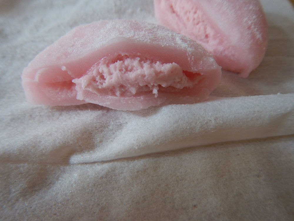 食べてみると、モチモチした食感と、とろ~り舌触り。苺の味とクリームの甘さが美味しいです。